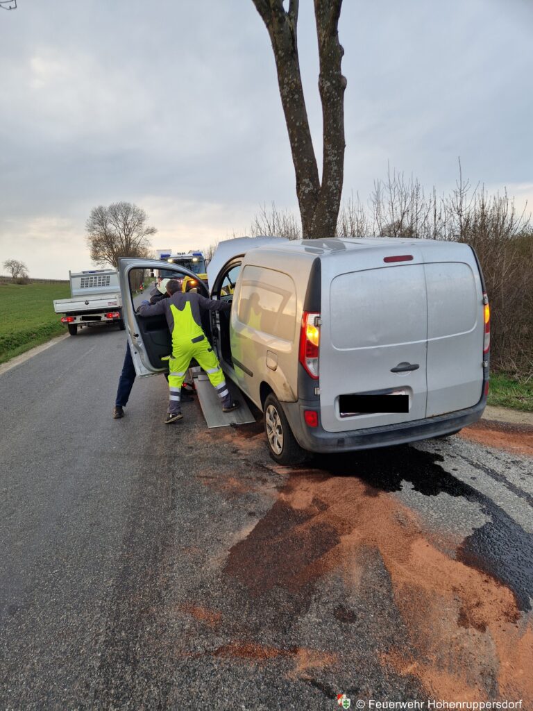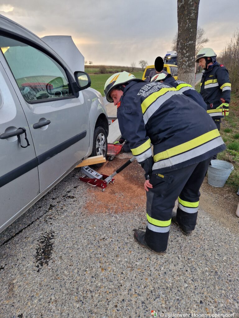 Nach dem Absichern der Einsatzstelle unterstützten wir das Abschleppunternehmen beim Anheben des Fahrzeuges und beim Aufsetzen auf die Fahrzeugrollen. Parallel dazu wurde Ölbindemittel aufgebracht, um die ausgelaufenen Betriebsmittel zu binden.
