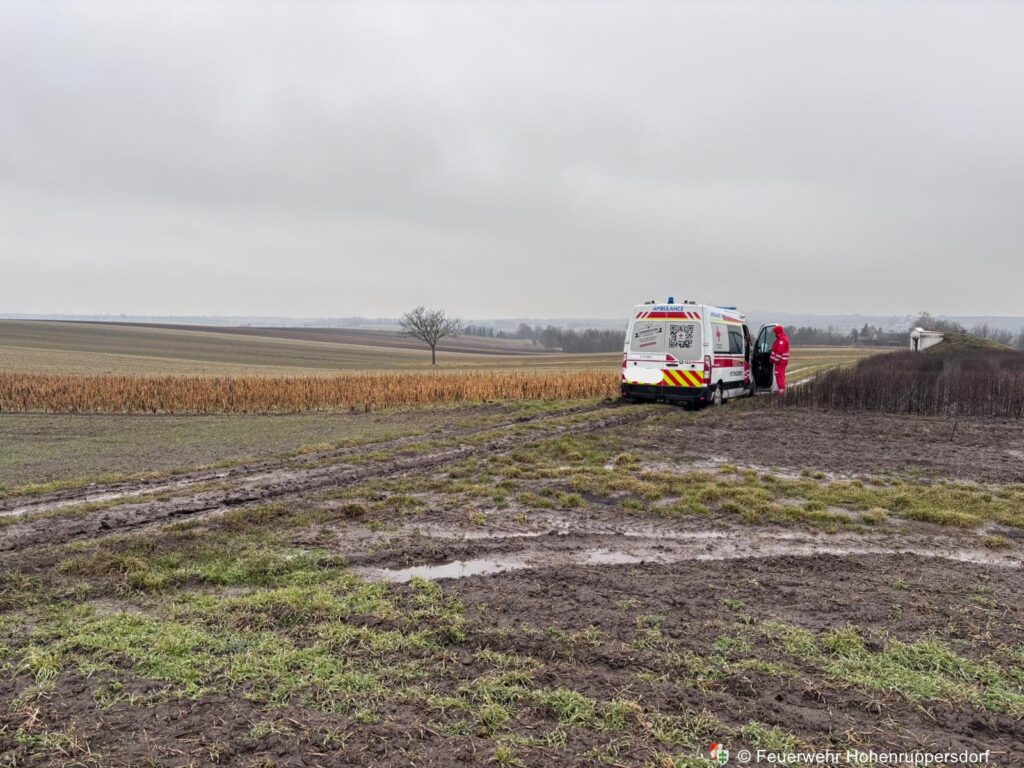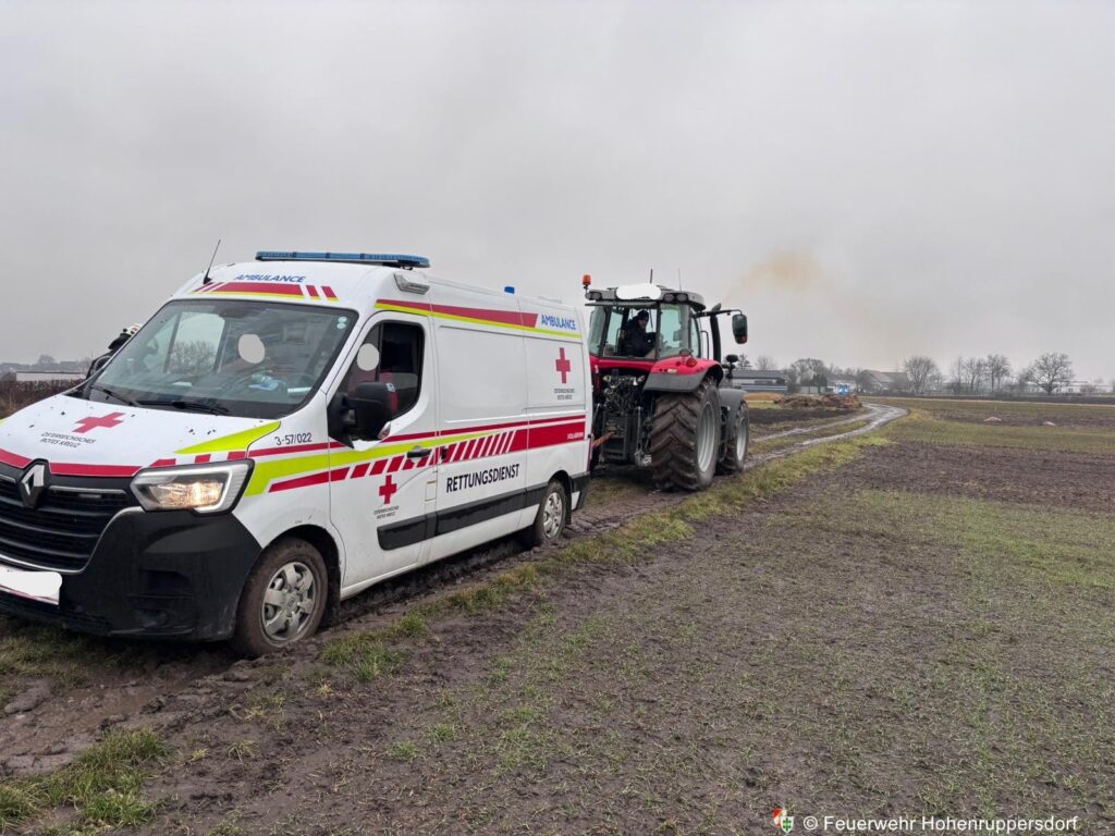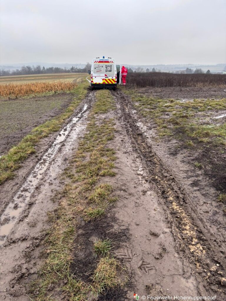 Am 29. Jänner 2026 wurden wir mittels BlaulichtSMS zum Einsatz „T1 – Bergung Rettungsfahrzeug“ alarmiert. Der gemeldete Unfallort entsprach nicht der tatsächlichen Einsatzstelle, weshalb zunächst eine Erkundung zu Fuß notwendig war. Nach kurzer Suche konnte ein Rettungsfahrzeug lokalisiert werden, das aufgrund der schlechten Witterungsbedingungen auf einem Feldweg stecken geblieben war.