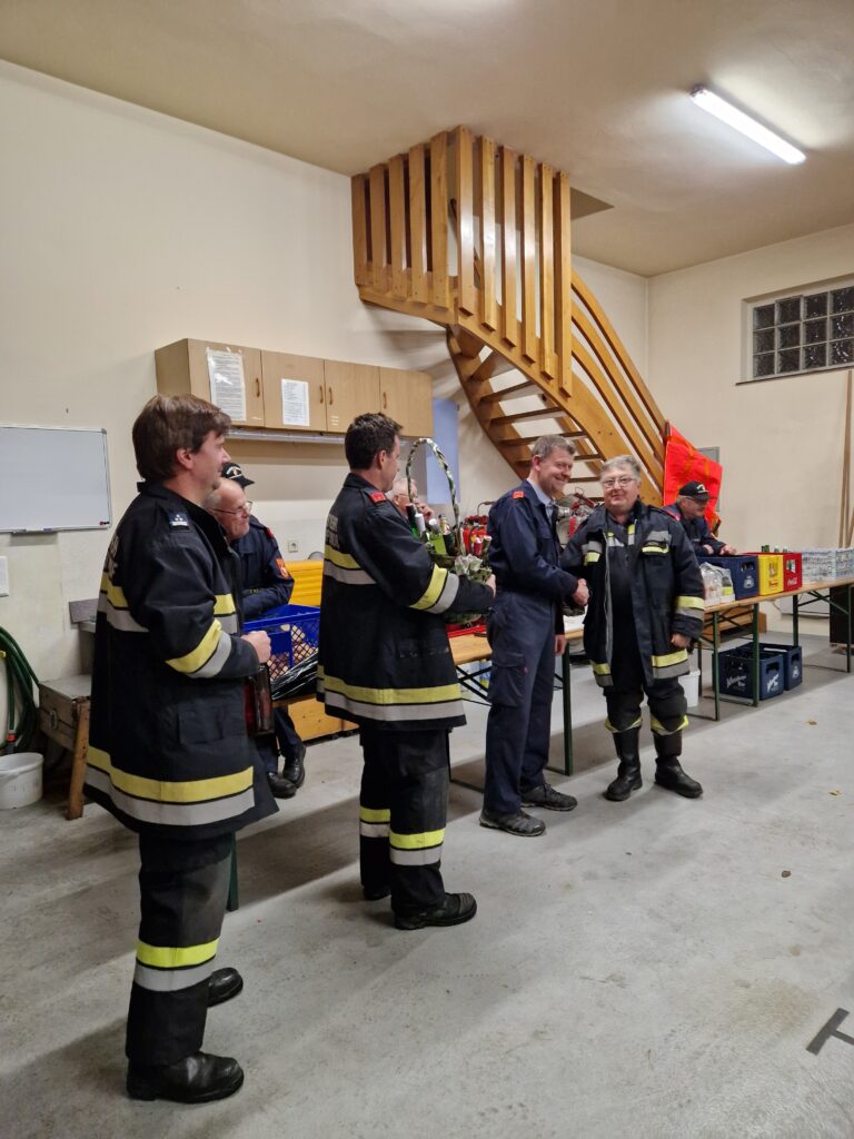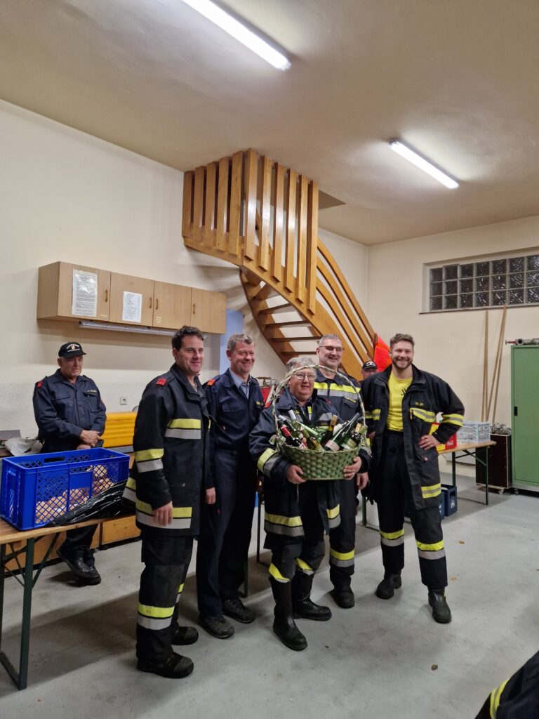 Im Anschluss an die Übung fand ein gemeinsamer Ausklang bei Speis und Trank im Feuerwehrhaus Hohenruppersdorf statt. Dabei wurde HBI Josef Köpf, dem langjährigen Unterabschnittskommandanten, für seine engagierte Tätigkeit gedankt – es war eine seiner letzten Übungen in dieser Funktion. Die Kommandanten der teilnehmenden Feuerwehren überreichten ihm als Zeichen der Wertschätzung einen Geschenkskorb mit diversen Weinen von den Winzern des Unterabschnittes.