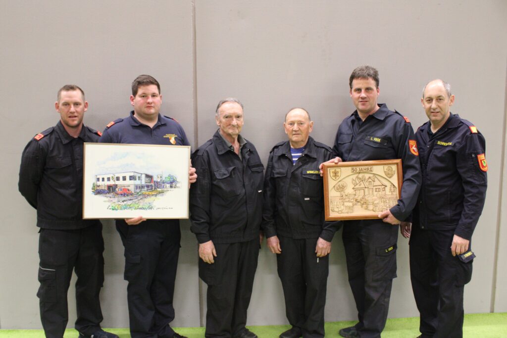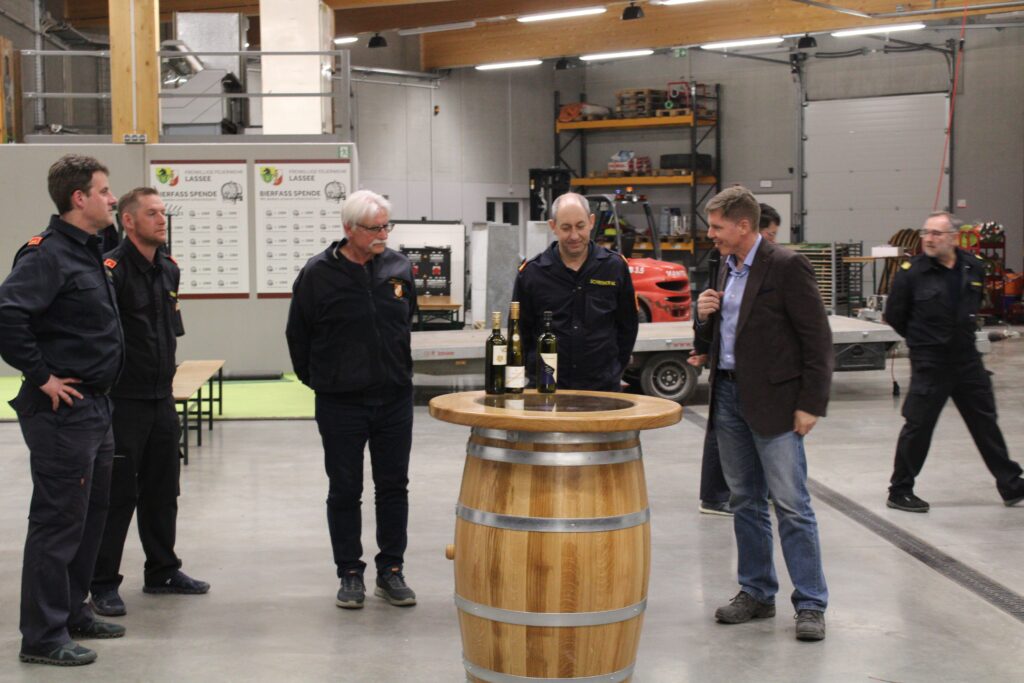 Im Anschluss daran fand die Geschenkübergabe statt. Unsere Wehr überreichte ein kunstvoll geschnitztes Fass – angefertigt von unserem aktiven Kameraden aus der Fassbinderei Polansky – versehen mit den Wappen beider Feuerwehren (hergestellt von KreativHirsch). Dieses besondere Geschenk kann künftig auch als Stehtisch verwendet werden. Die FF Lassee bedankte sich mit einem Gemälde von Laf Wurm sowie ein Bild, angefertigt von Gerhard Horvat, welches als sichtbares Zeichen der langjährigen Freundschaft überreicht wurde.