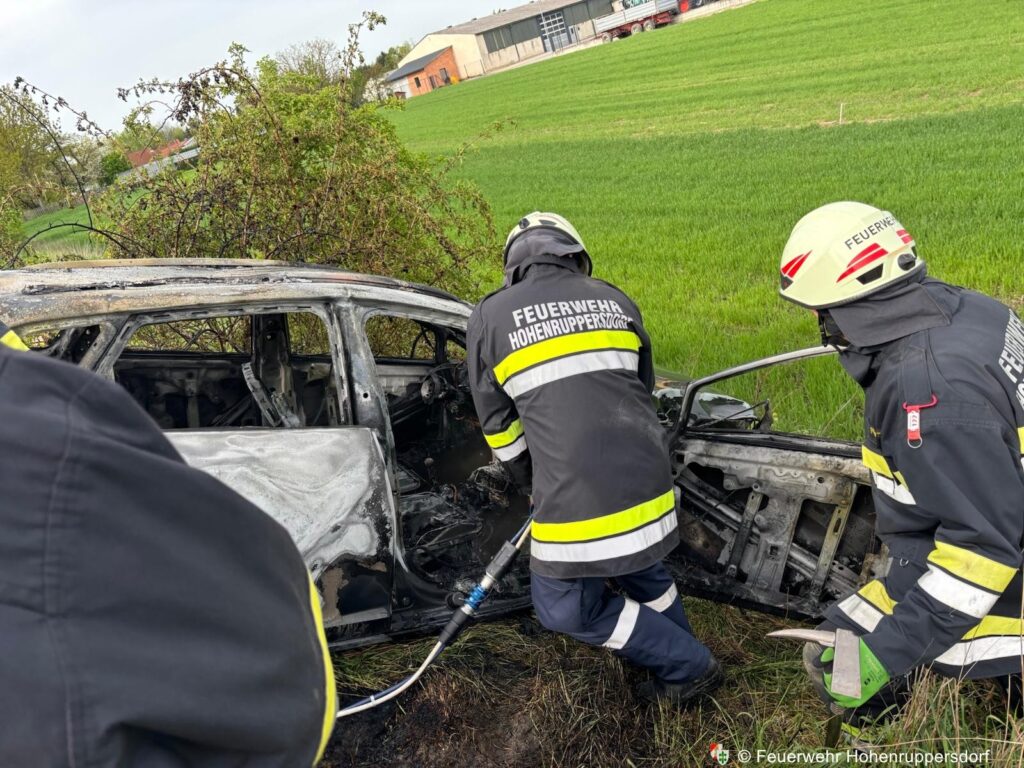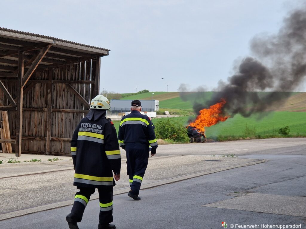 - Ein verunfalltes Fahrzeug im Vollbrand