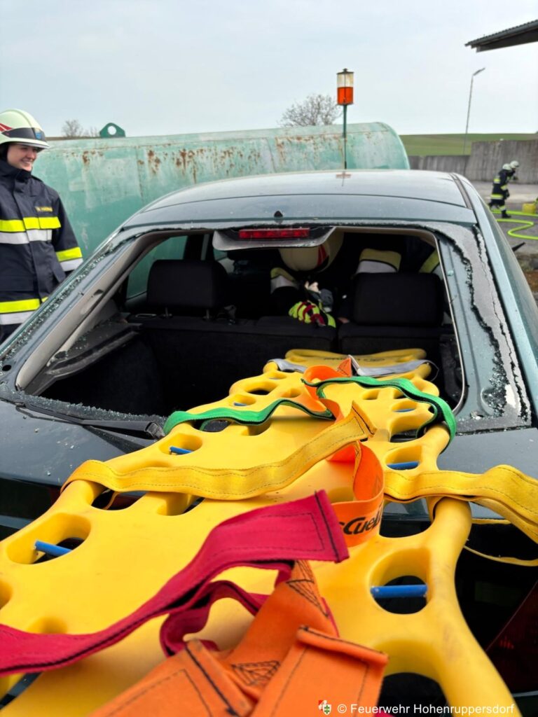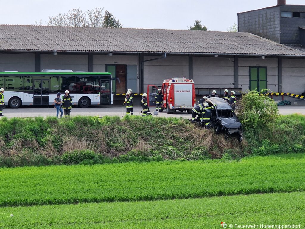 - Ein weiteres gegen einen Treibstofftank gepralltest Fahrzeug mit verletzter Person im Wageninneren